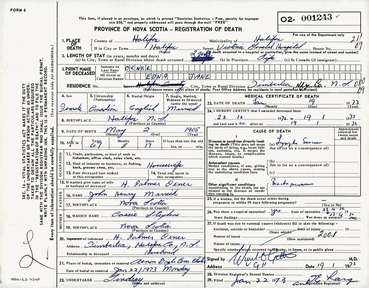 Female Death Registration: Year: 1973 number: 1243