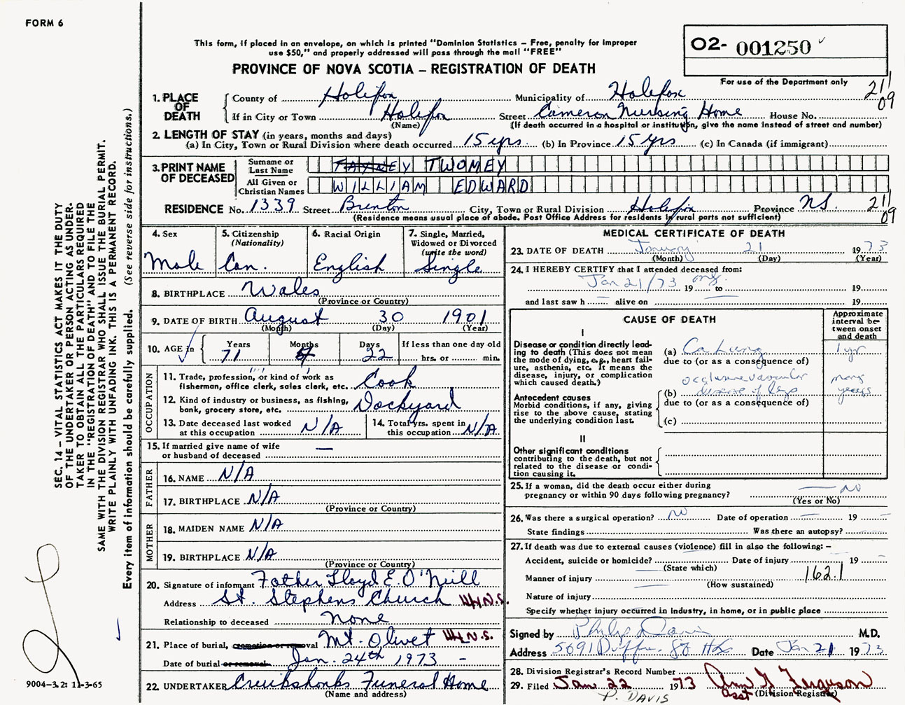 Male Death Registration: Year: 1973 number: 1250
