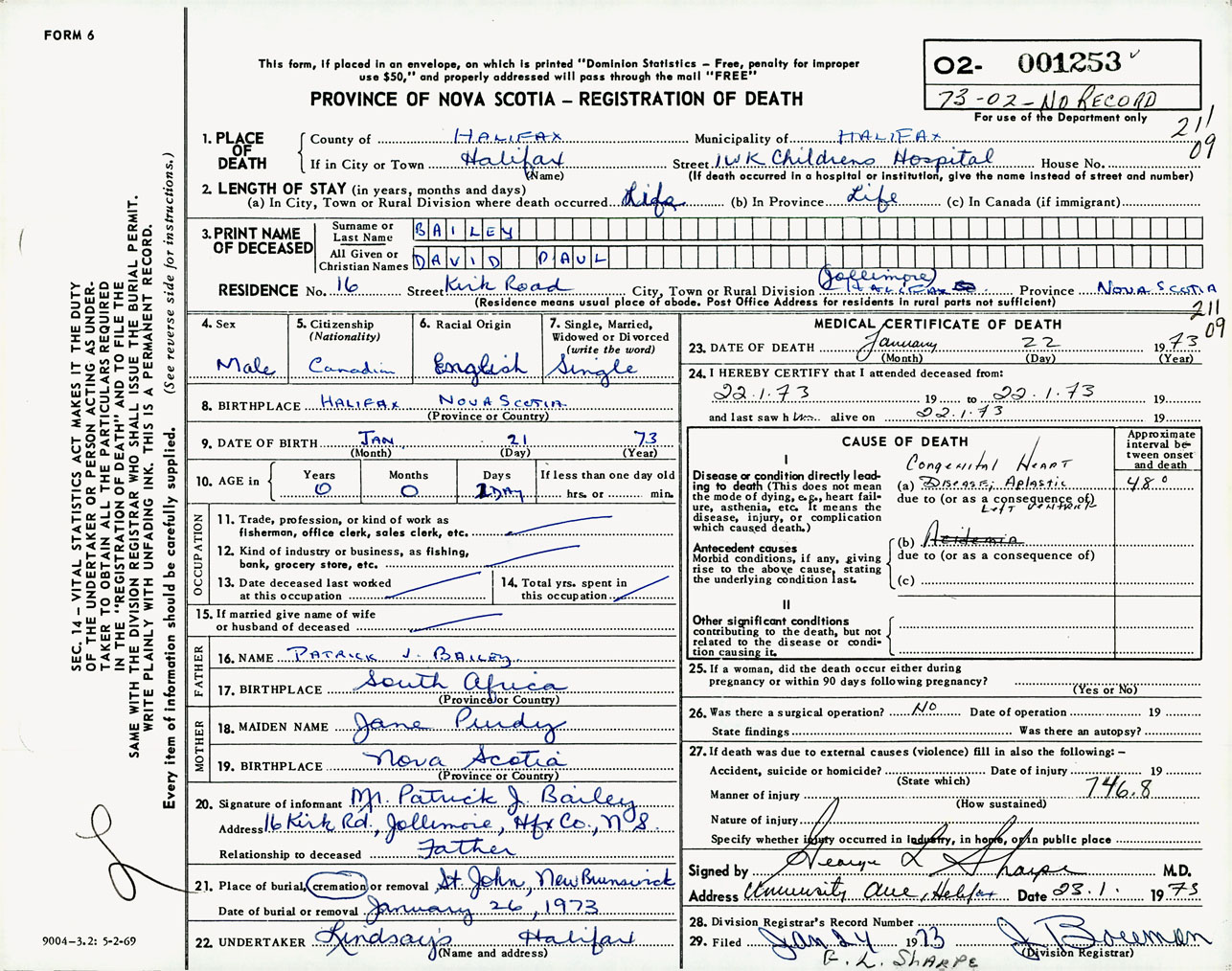 Male Death Registration: Year: 1973 number: 1253
