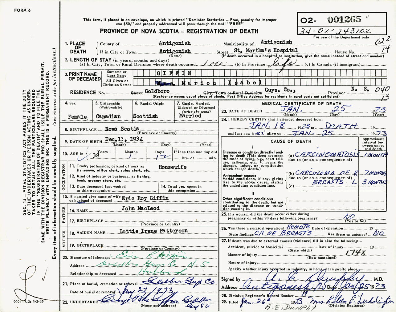 Female Death Registration: Year: 1973 number: 1265