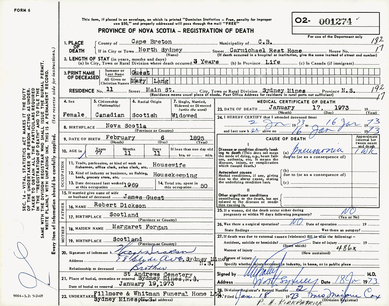 Female Death Registration: Year: 1973 number: 1274