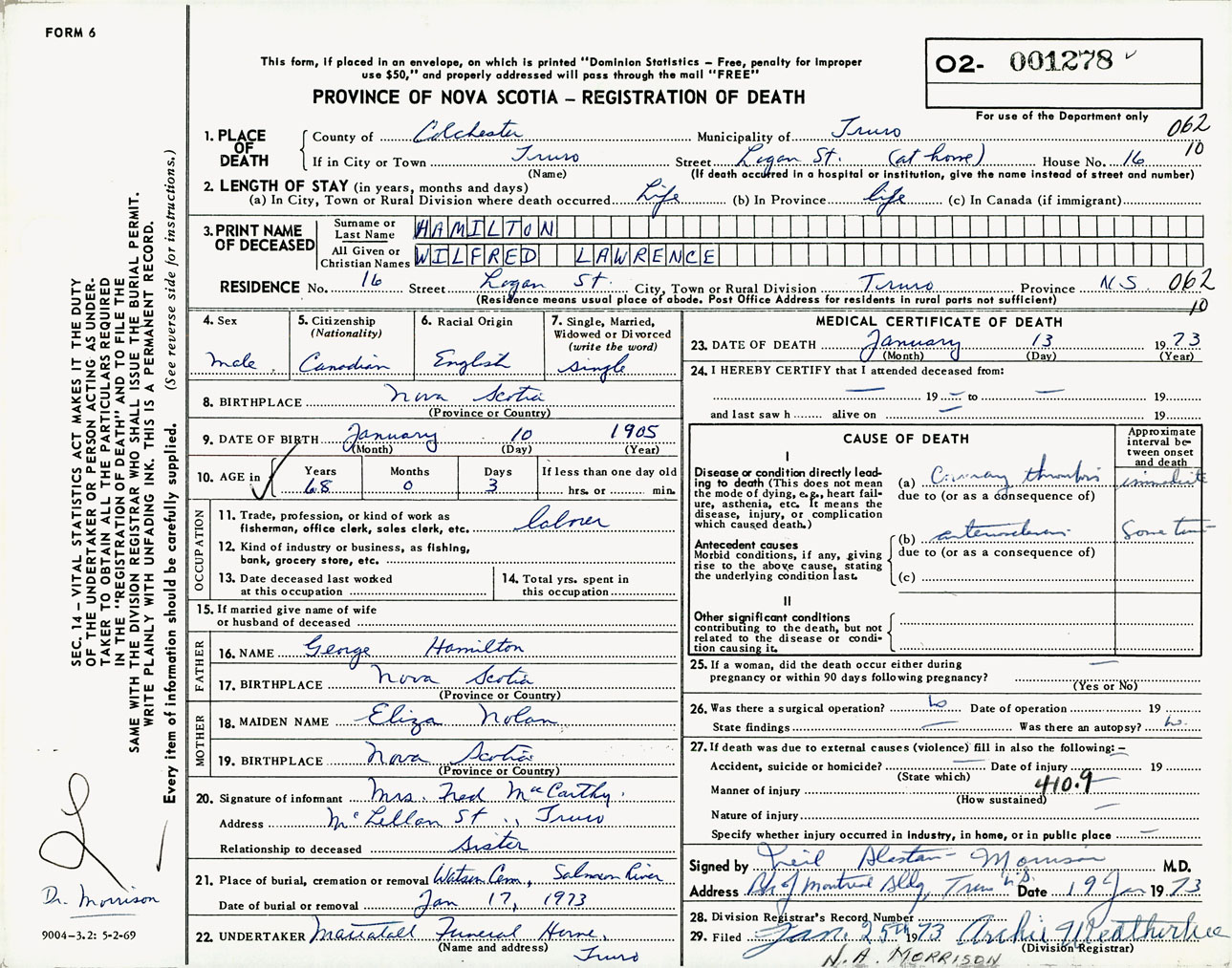 Male Death Registration: Year: 1973 number: 1278