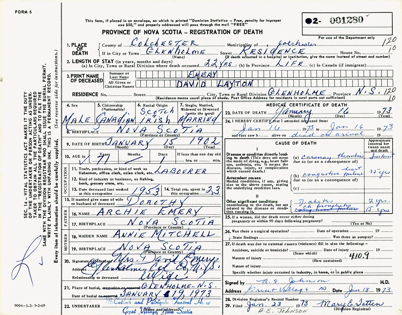 Male Death Registration: Year: 1973 number: 1280