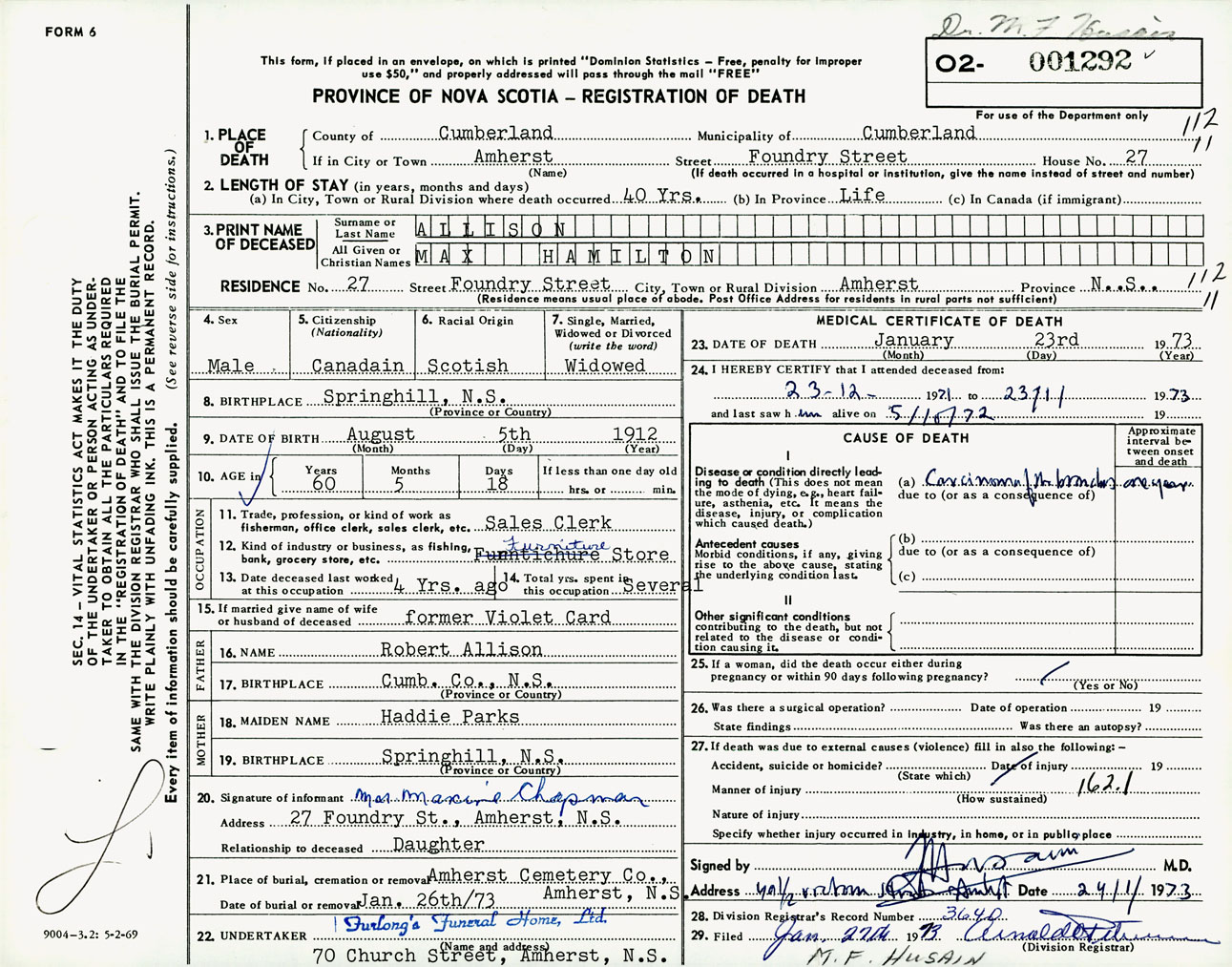 Male Death Registration: Year: 1973 number: 1292