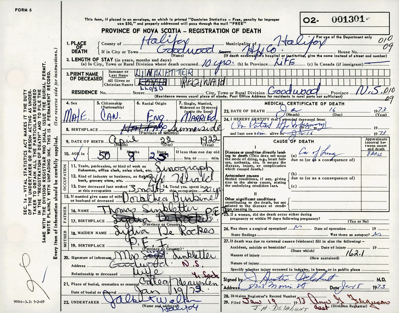 Male Death Registration: Year: 1973 number: 1301