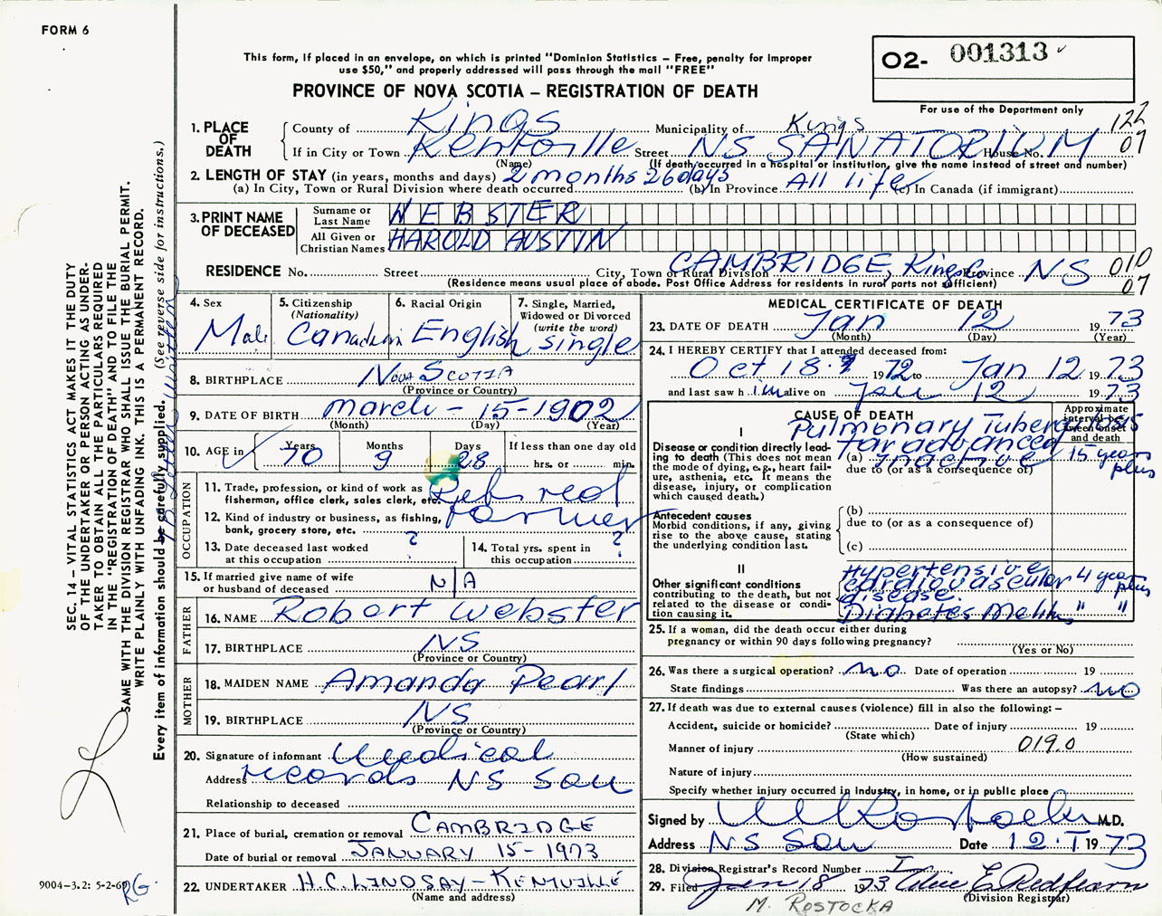 Male Death Registration: Year: 1973 number: 1313