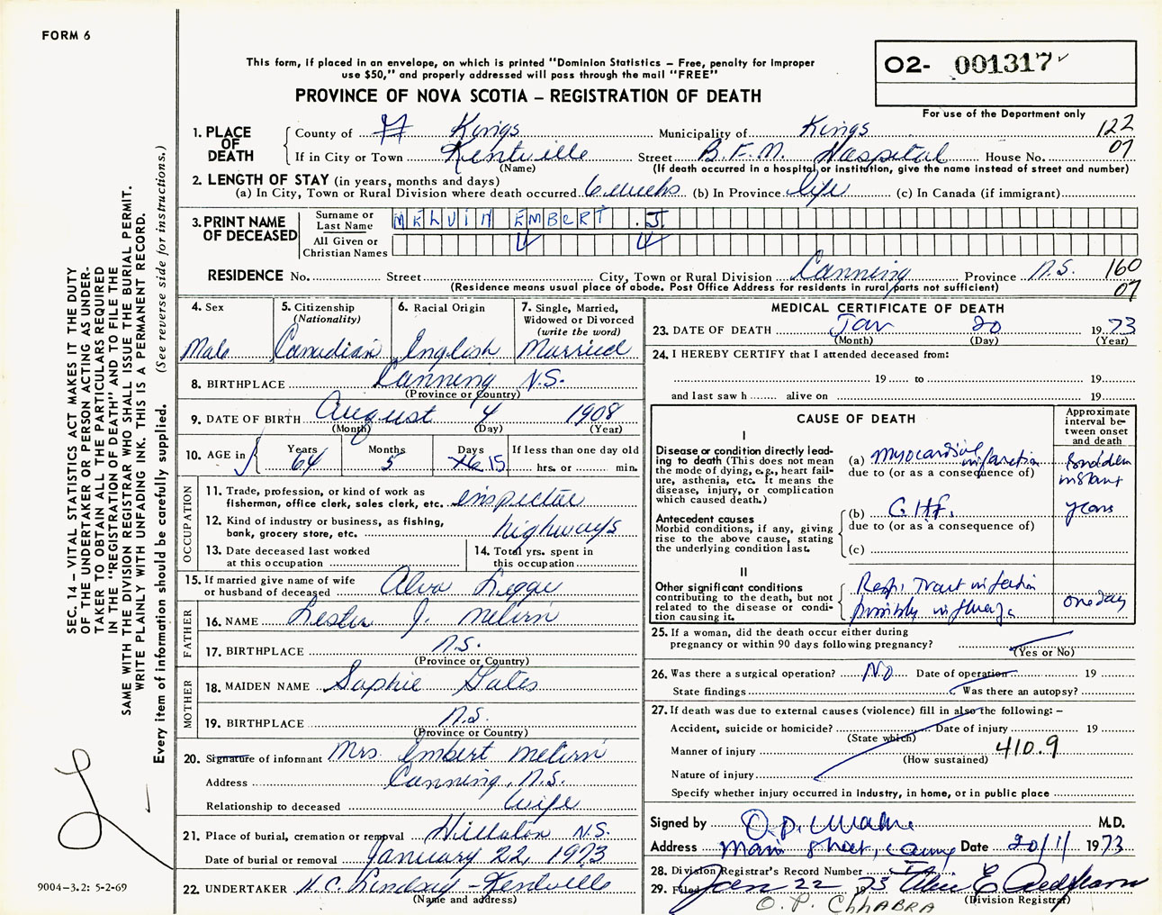 Male Death Registration: Year: 1973 number: 1317