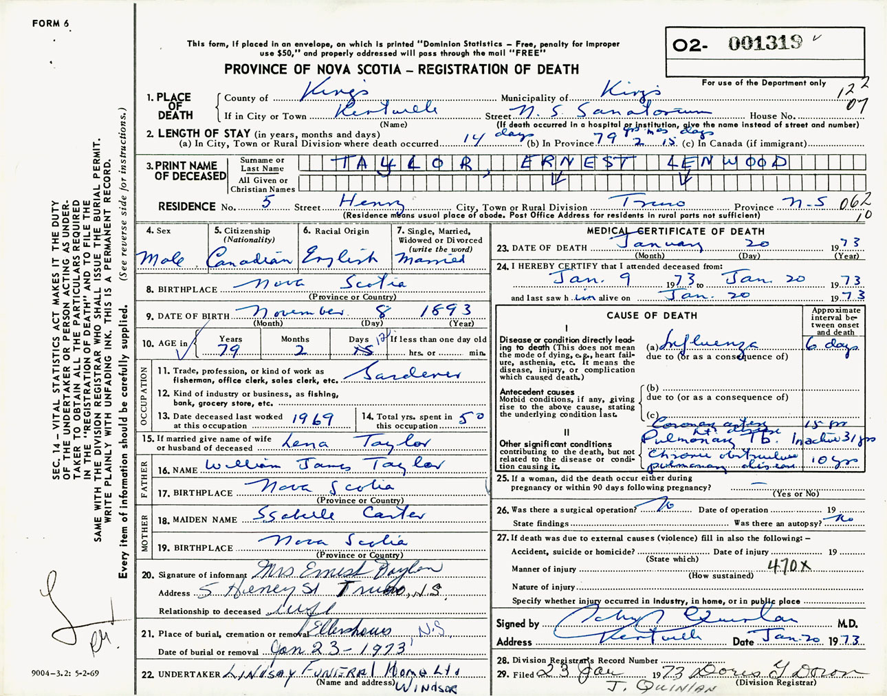 Male Death Registration: Year: 1973 number: 1319
