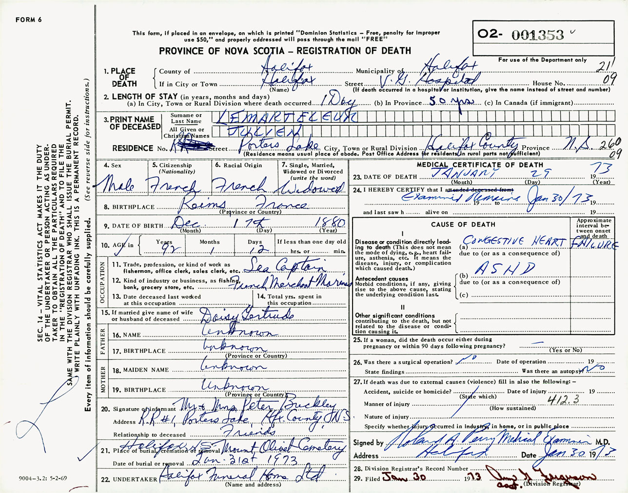 Male Death Registration: Year: 1973 number: 1353