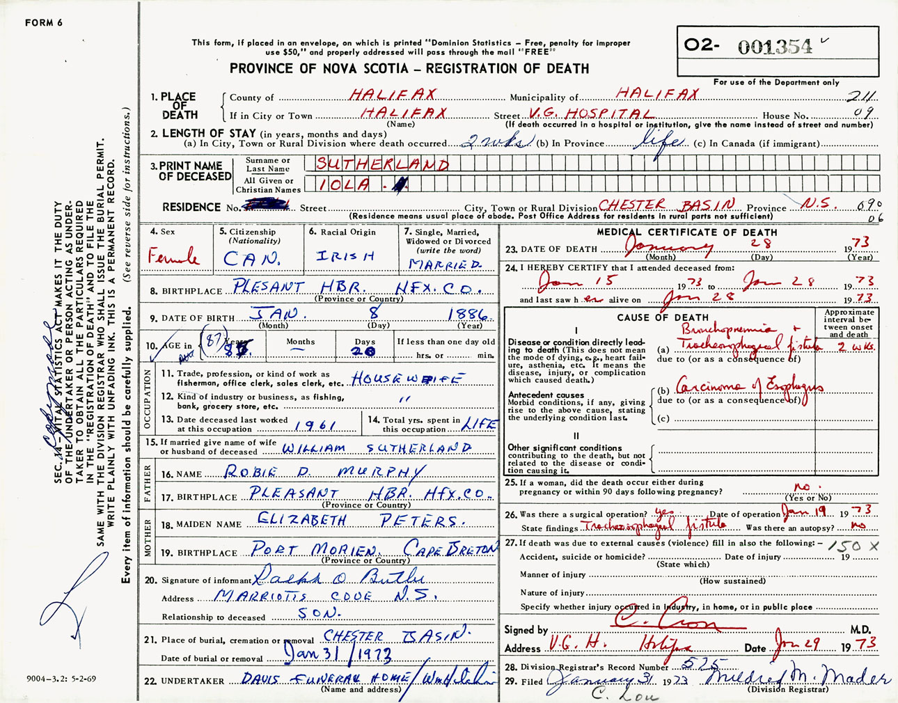 Female Death Registration: Year: 1973 number: 1354
