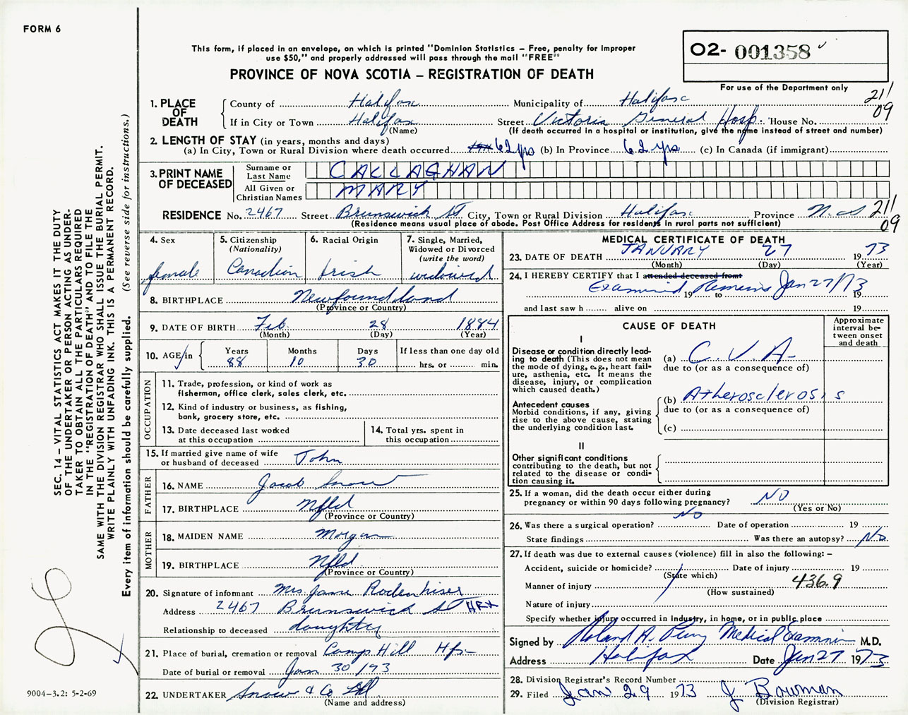 Female Death Registration: Year: 1973 number: 1358