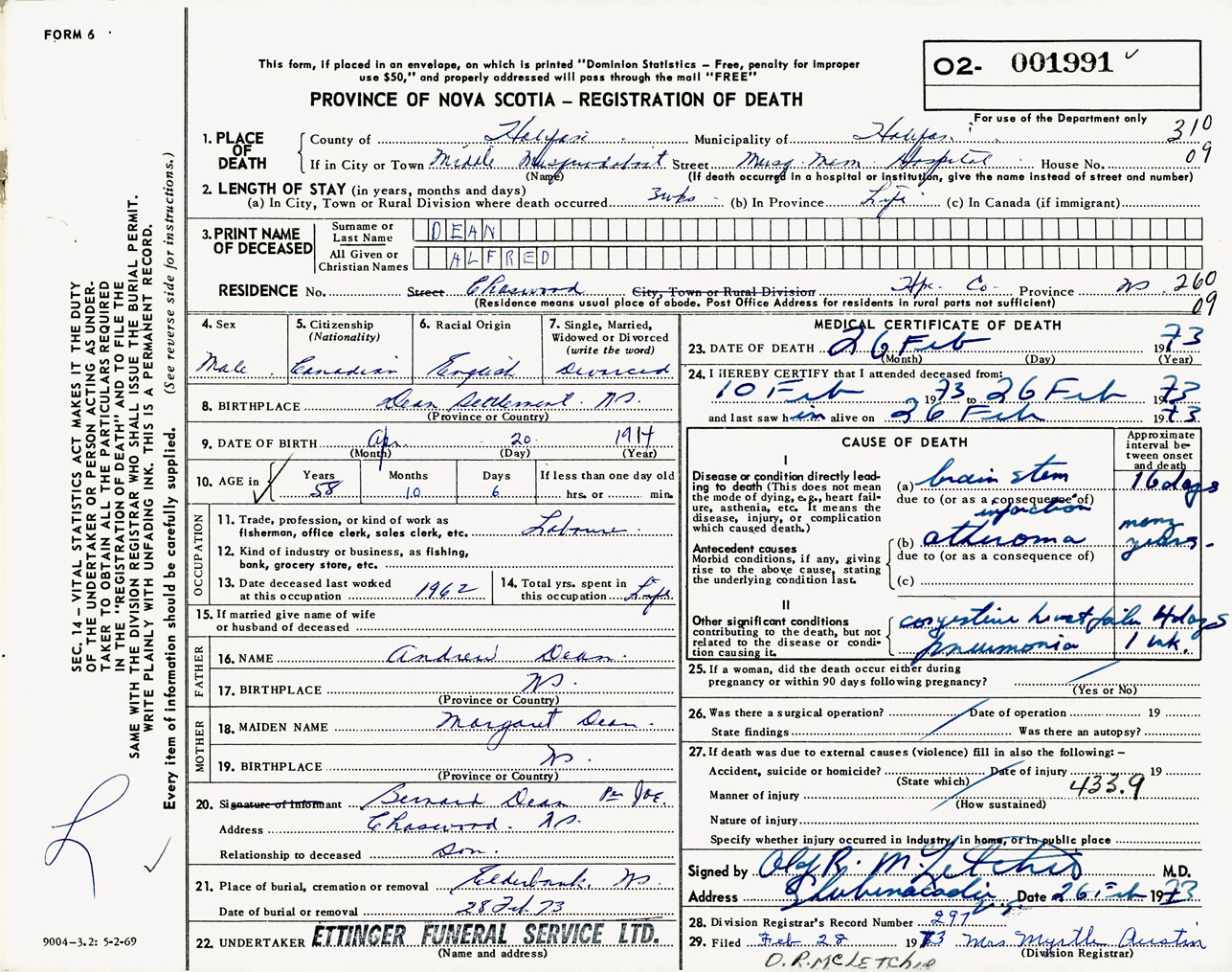 Male Death Registration: Year: 1973 number: 1991