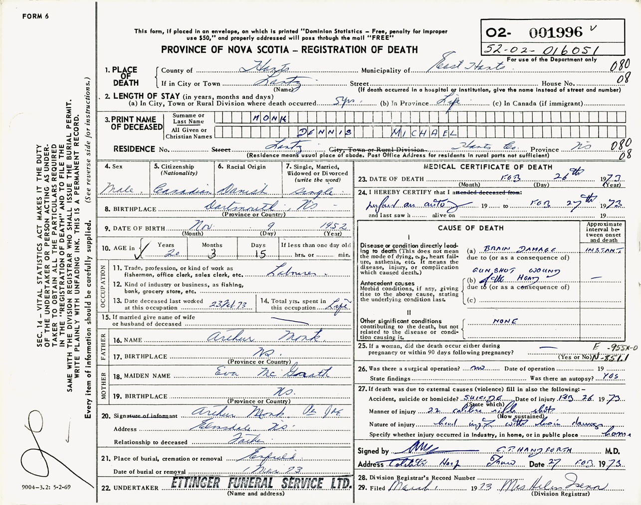 Male Death Registration: Year: 1973 number: 1996