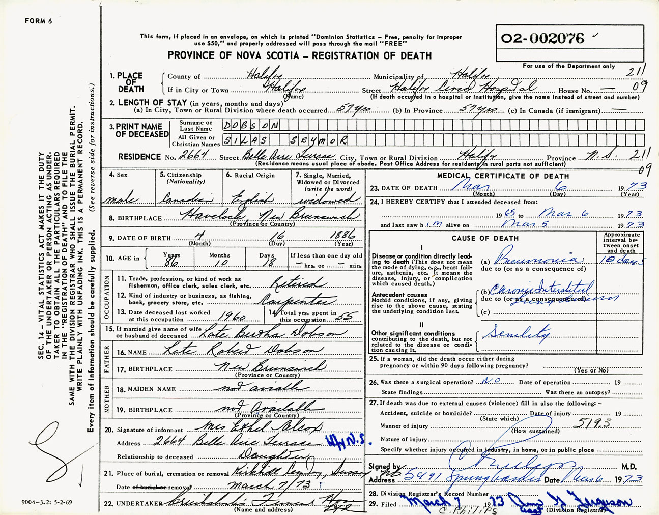 Male Death Registration: Year: 1973 number: 2076