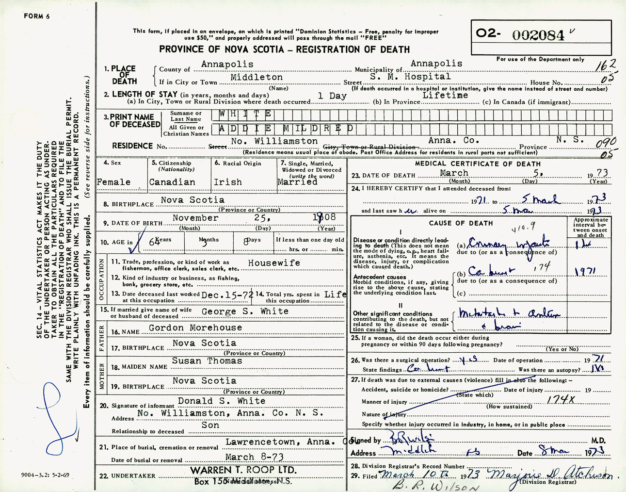 Female Death Registration: Year: 1973 number: 2084