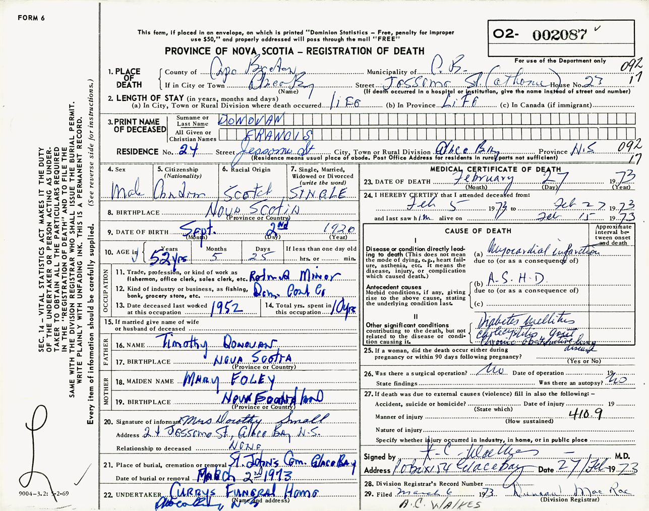 Male Death Registration: Year: 1973 number: 2087