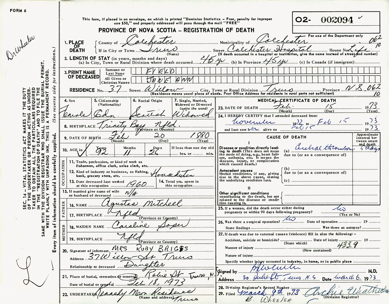 Female Death Registration: Year: 1973 number: 2094
