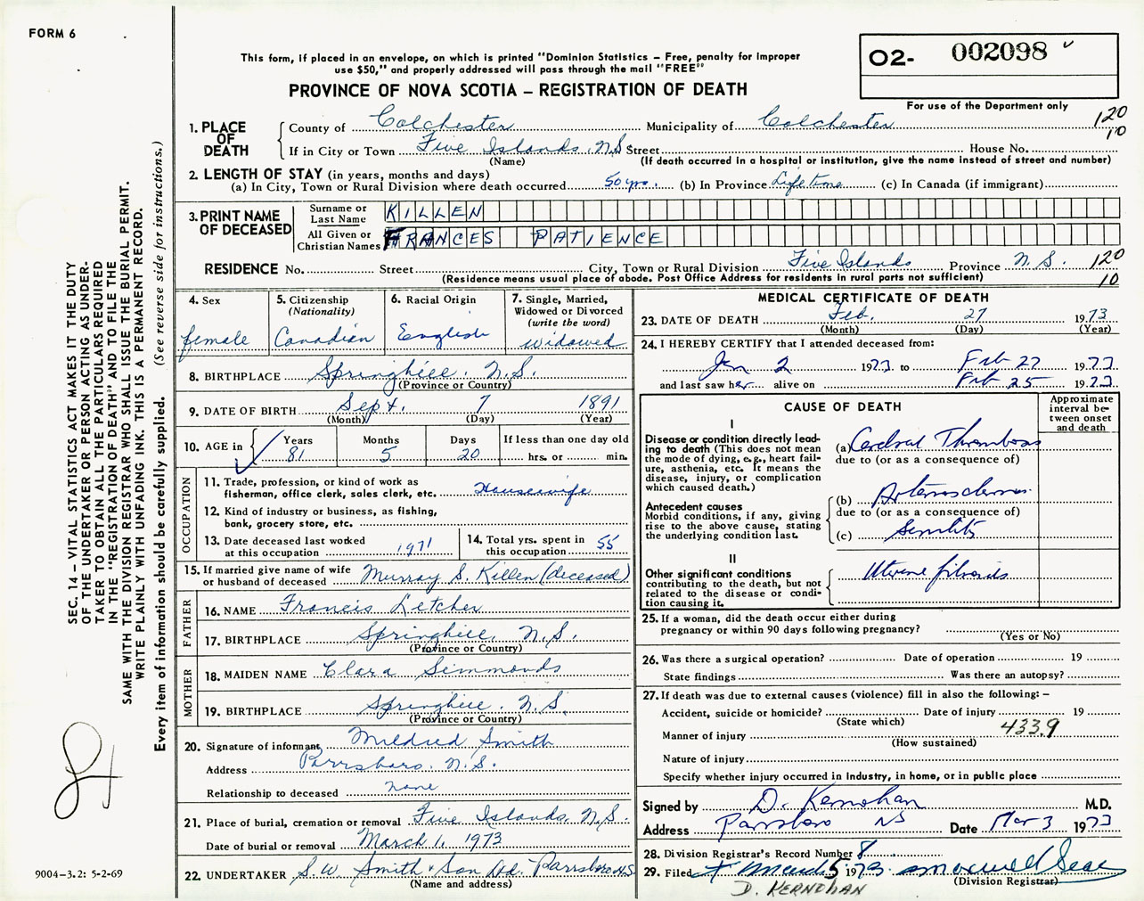 Female Death Registration: Year: 1973 number: 2098