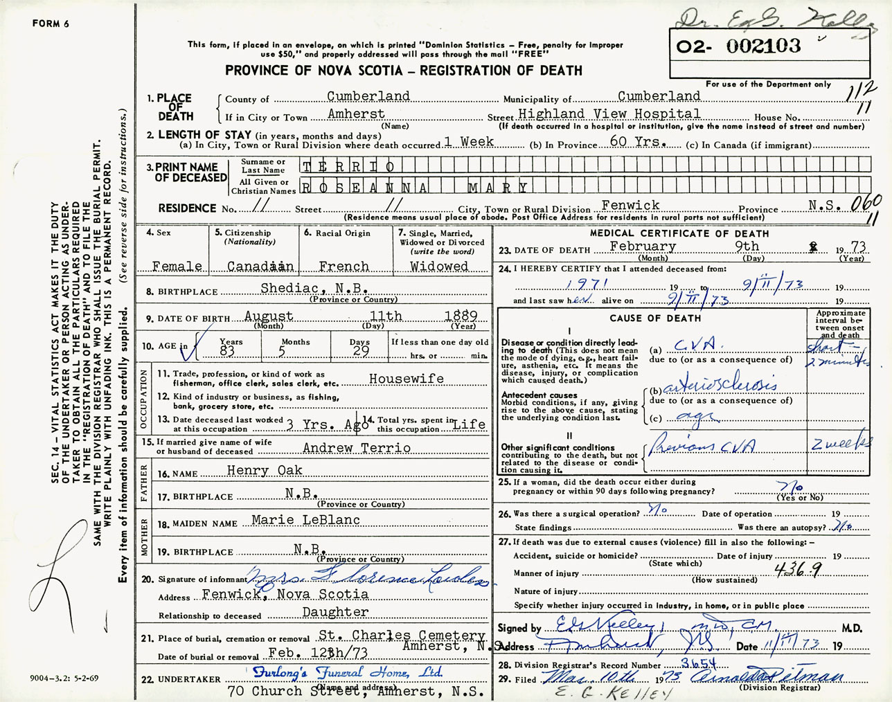 Female Death Registration: Year: 1973 number: 2103