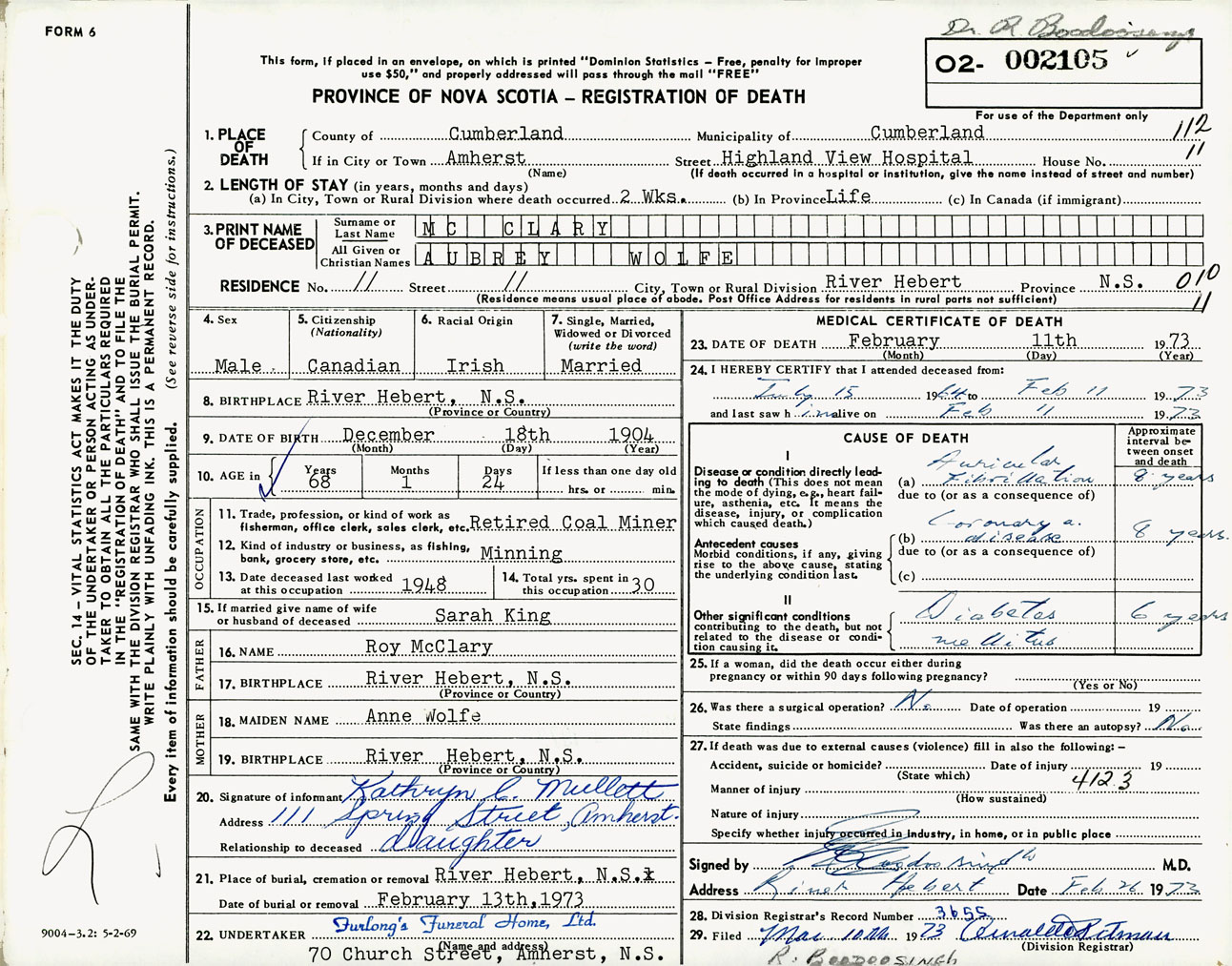Male Death Registration: Year: 1973 number: 2105