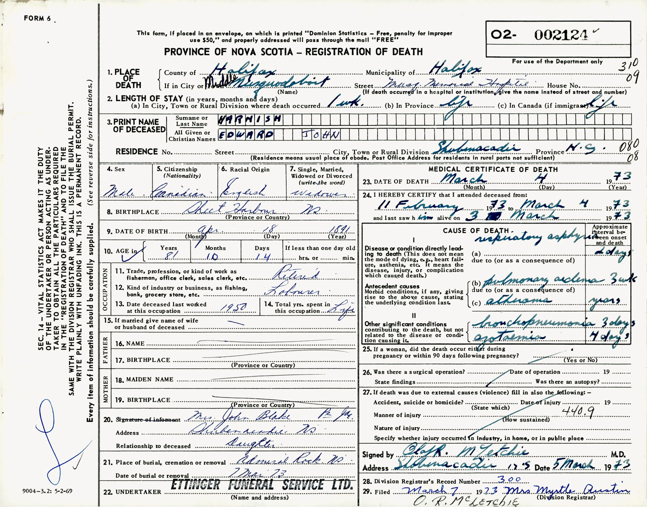 Male Death Registration: Year: 1973 number: 2124
