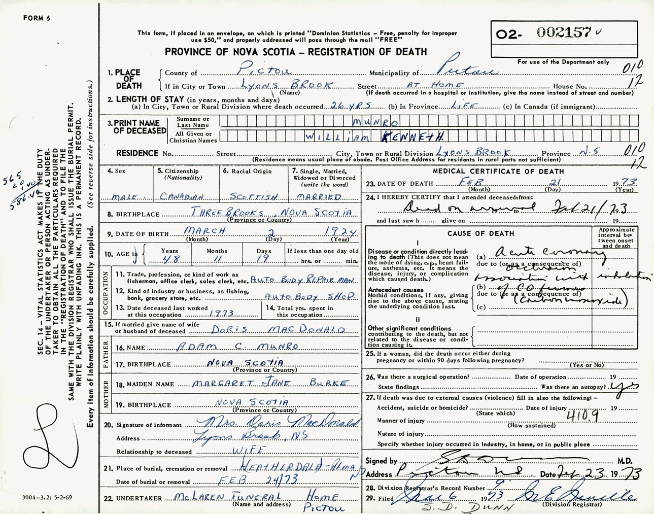 Male Death Registration: Year: 1973 number: 2157