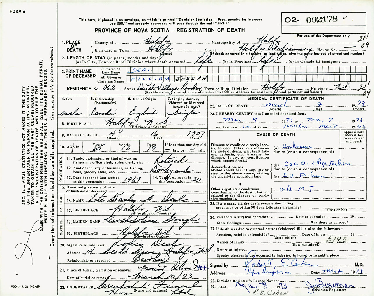 Male Death Registration: Year: 1973 number: 2178