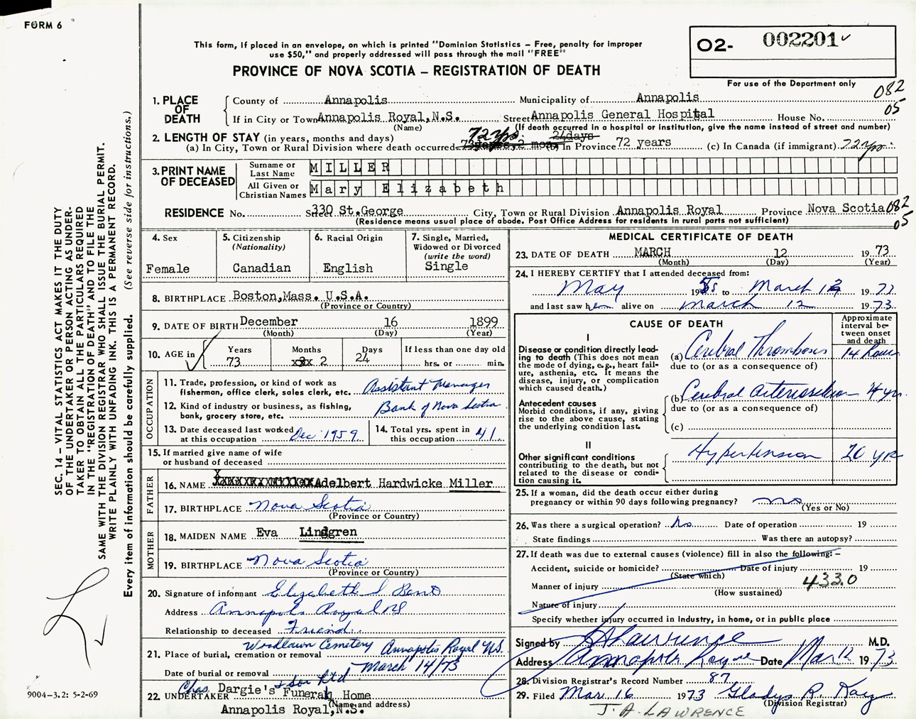 Female Death Registration: Year: 1973 number: 2201