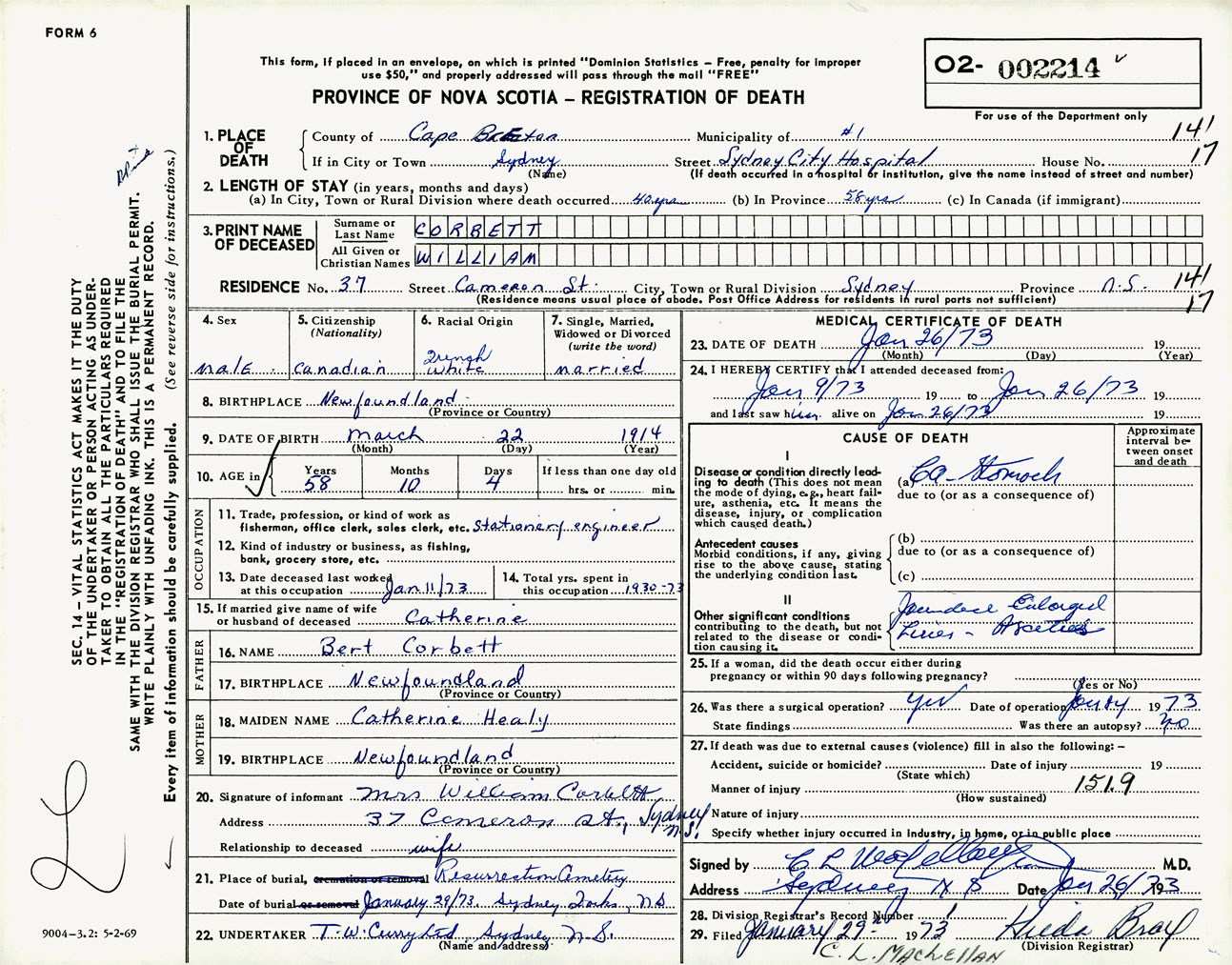Male Death Registration: Year: 1973 number: 2214
