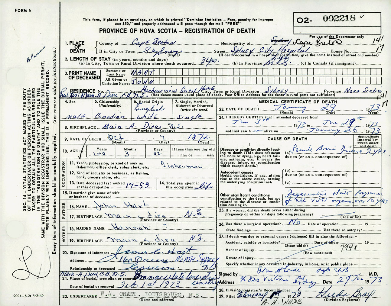 Male Death Registration: Year: 1973 number: 2218