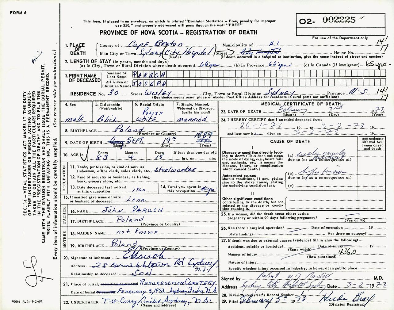 Male Death Registration: Year: 1973 number: 2225