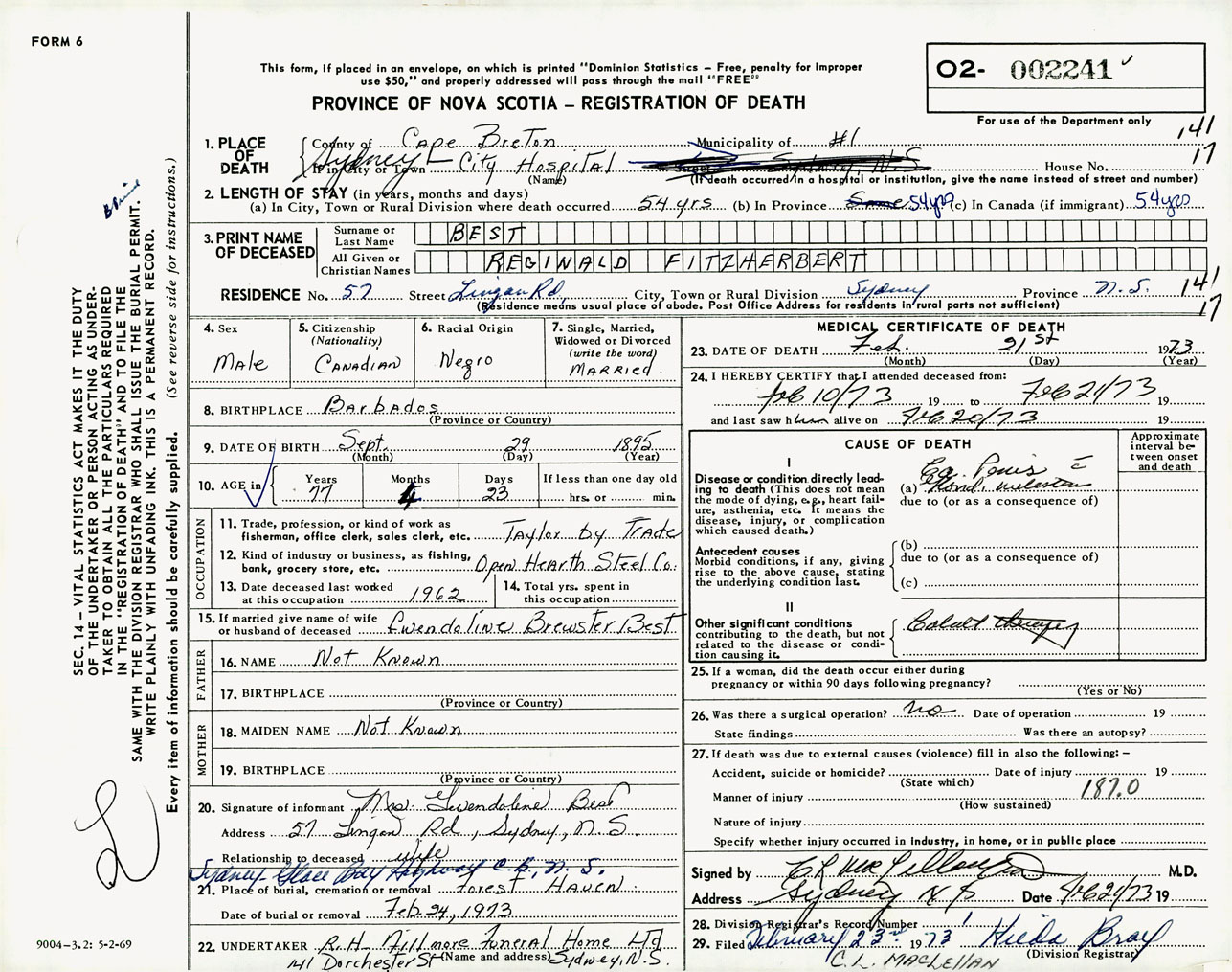 Male Death Registration: Year: 1973 number: 2241