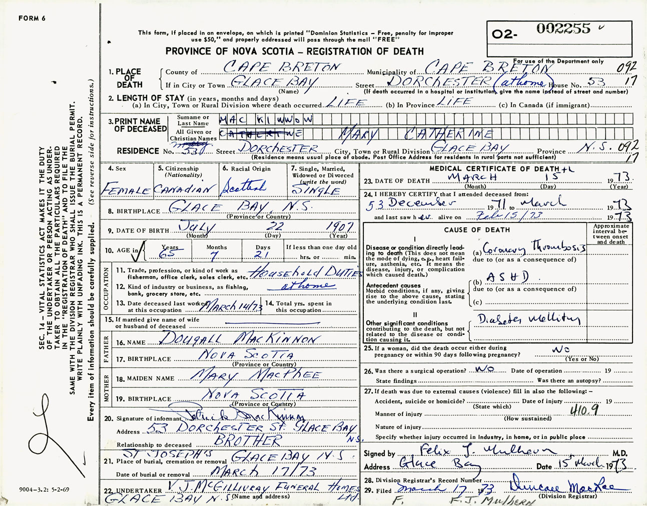 Female Death Registration: Year: 1973 number: 2255
