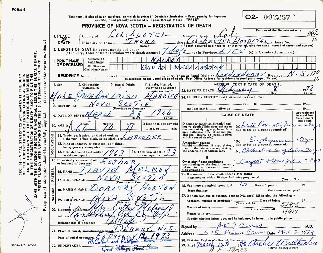 Male Death Registration: Year: 1973 number: 2257