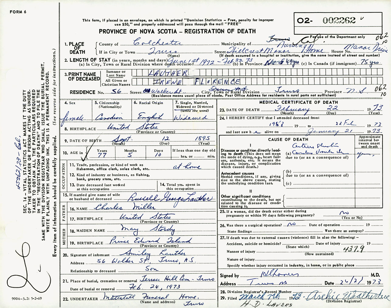Female Death Registration: Year: 1973 number: 2262