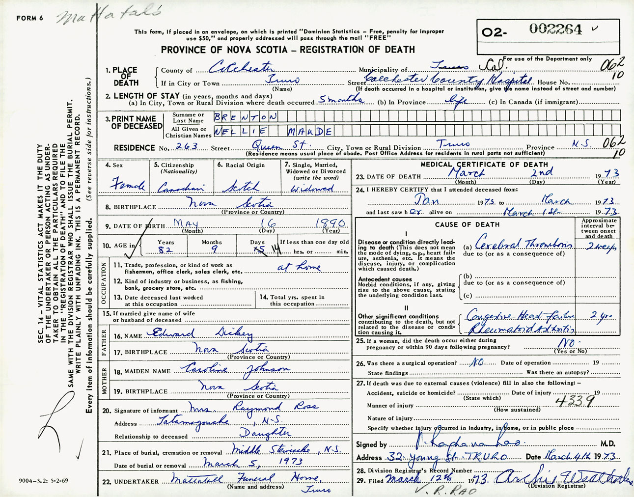 Female Death Registration: Year: 1973 number: 2264