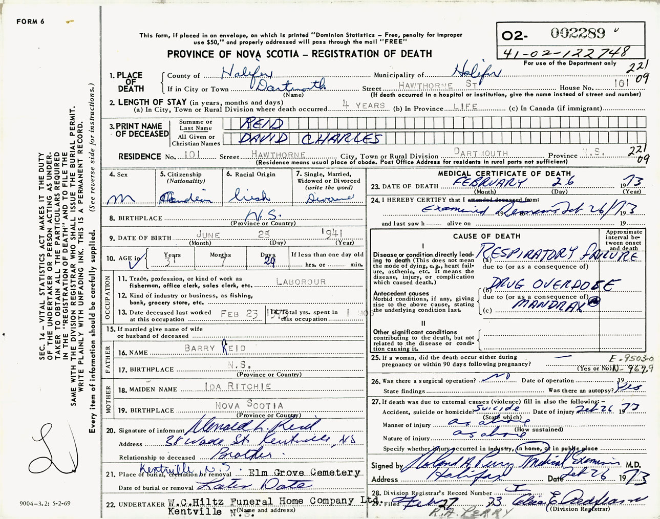 Male Death Registration: Year: 1973 number: 2289