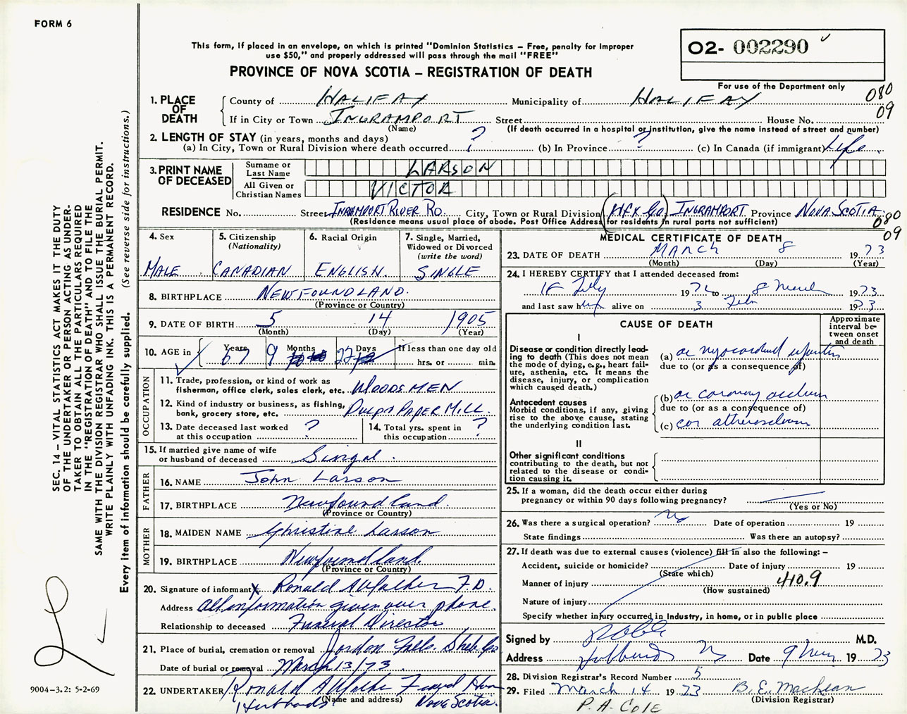 Male Death Registration: Year: 1973 number: 2290