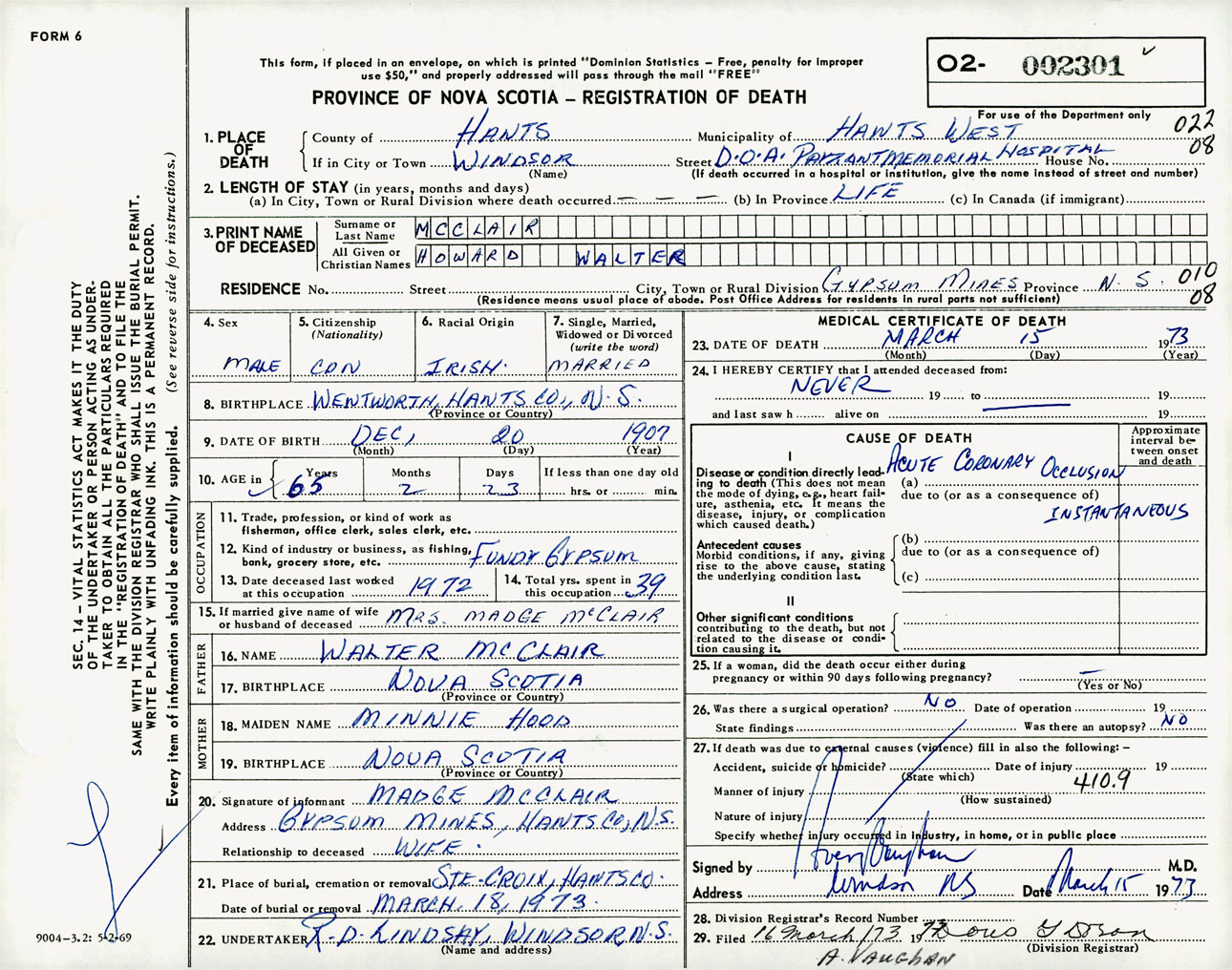 Male Death Registration: Year: 1973 number: 2301