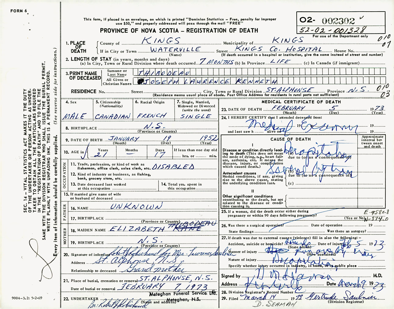 Male Death Registration: Year: 1973 number: 2302