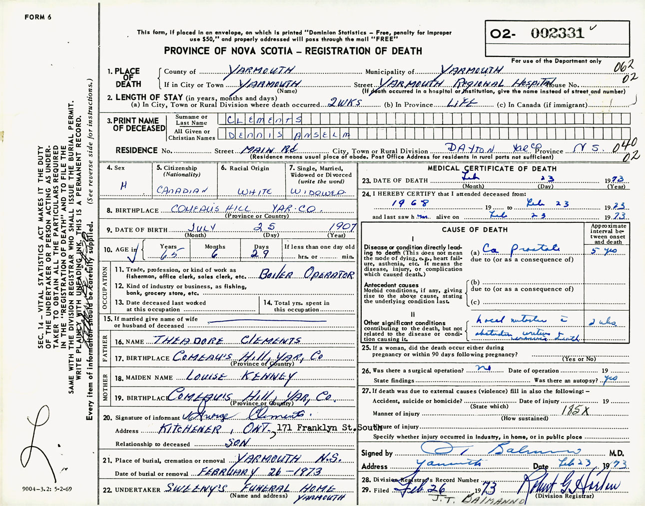 Male Death Registration: Year: 1973 number: 2331