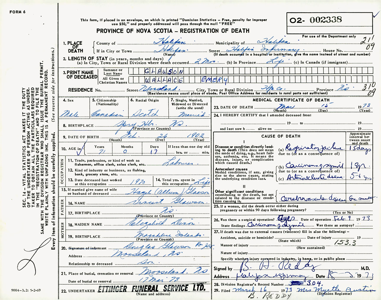 Male Death Registration: Year: 1973 number: 2338