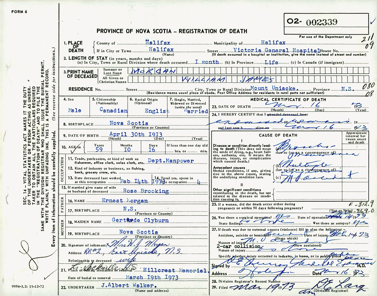 Male Death Registration: Year: 1973 number: 2339