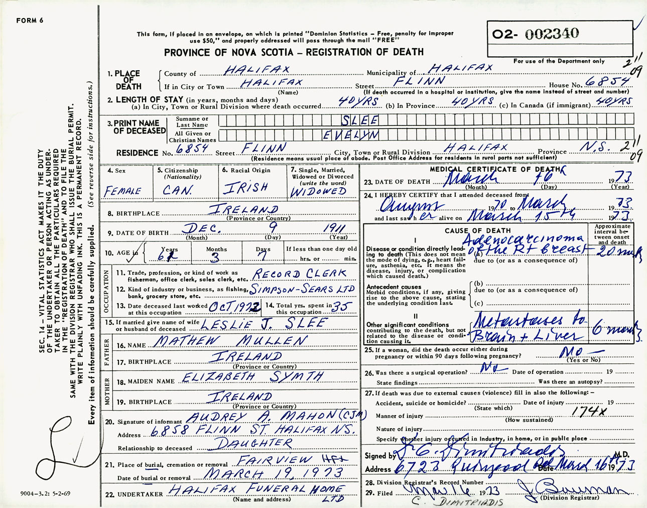 Female Death Registration: Year: 1973 number: 2340