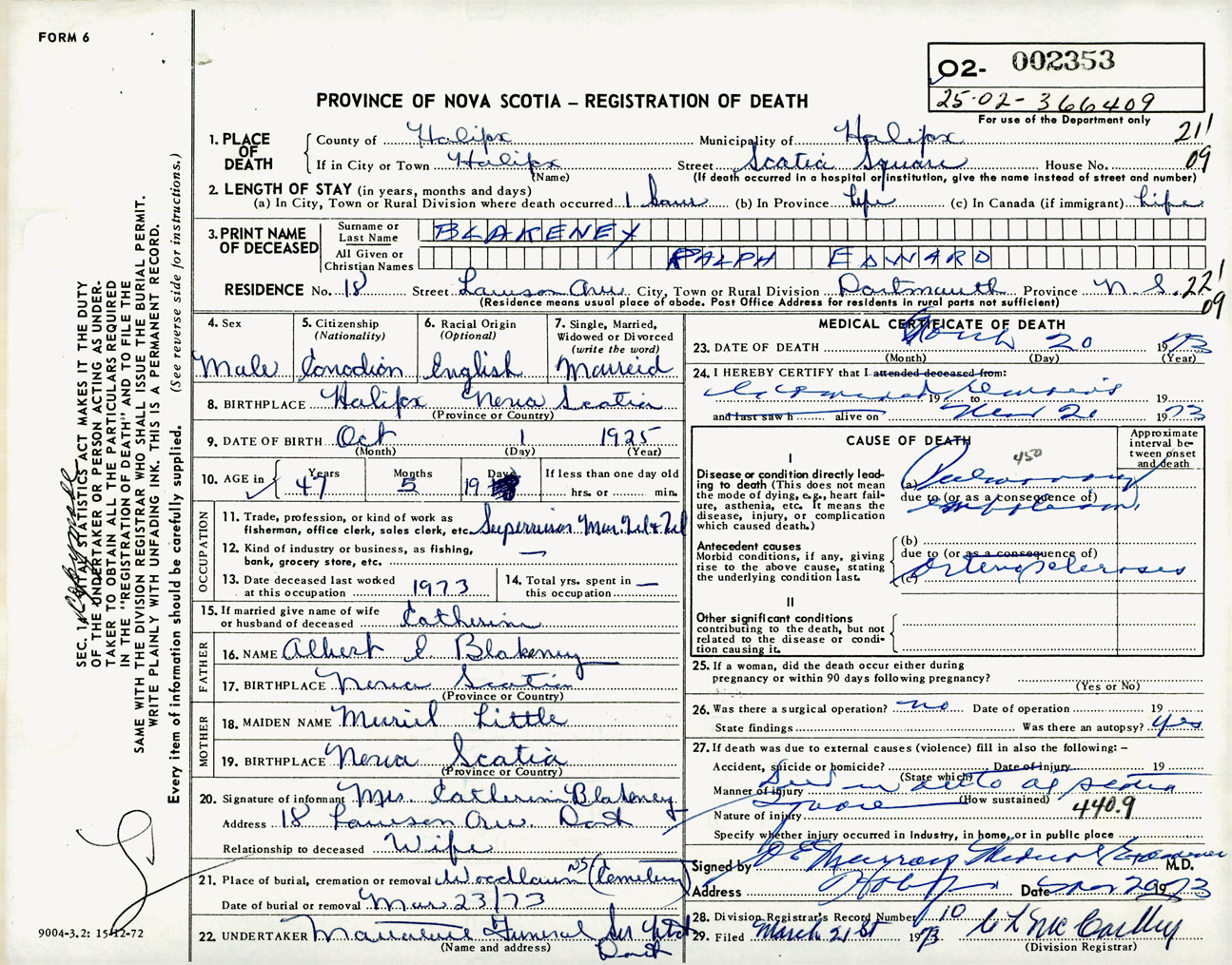 Male Death Registration: Year: 1973 number: 2353