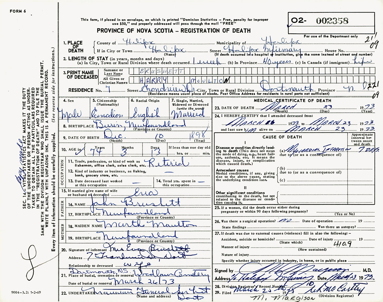 Male Death Registration: Year: 1973 number: 2358