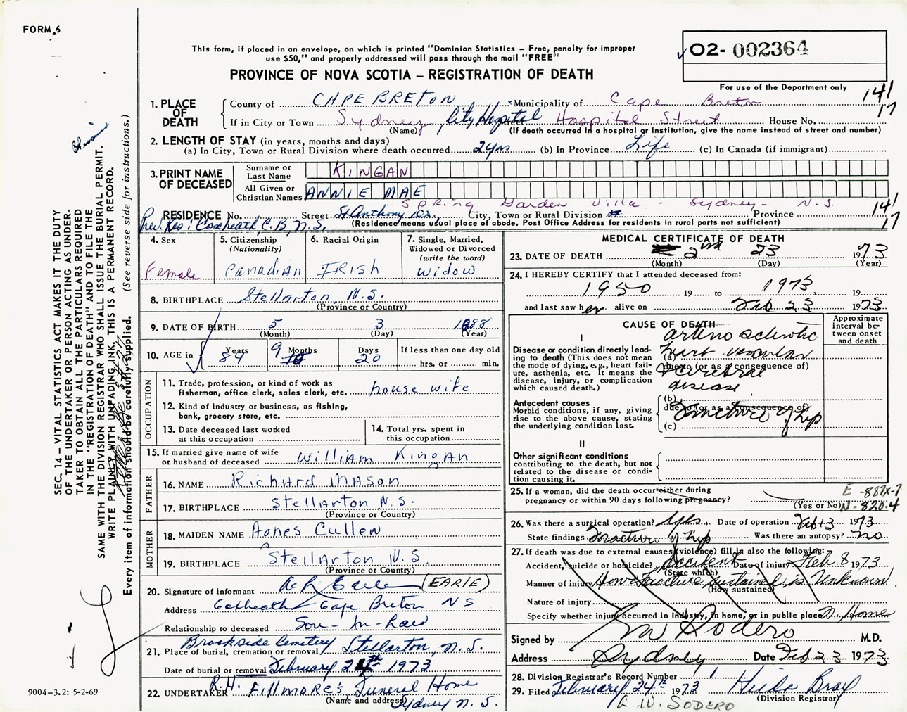Female Death Registration: Year: 1973 number: 2364