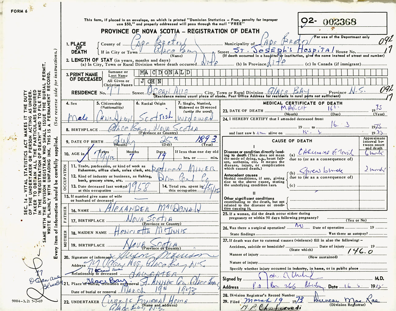 Male Death Registration: Year: 1973 number: 2368