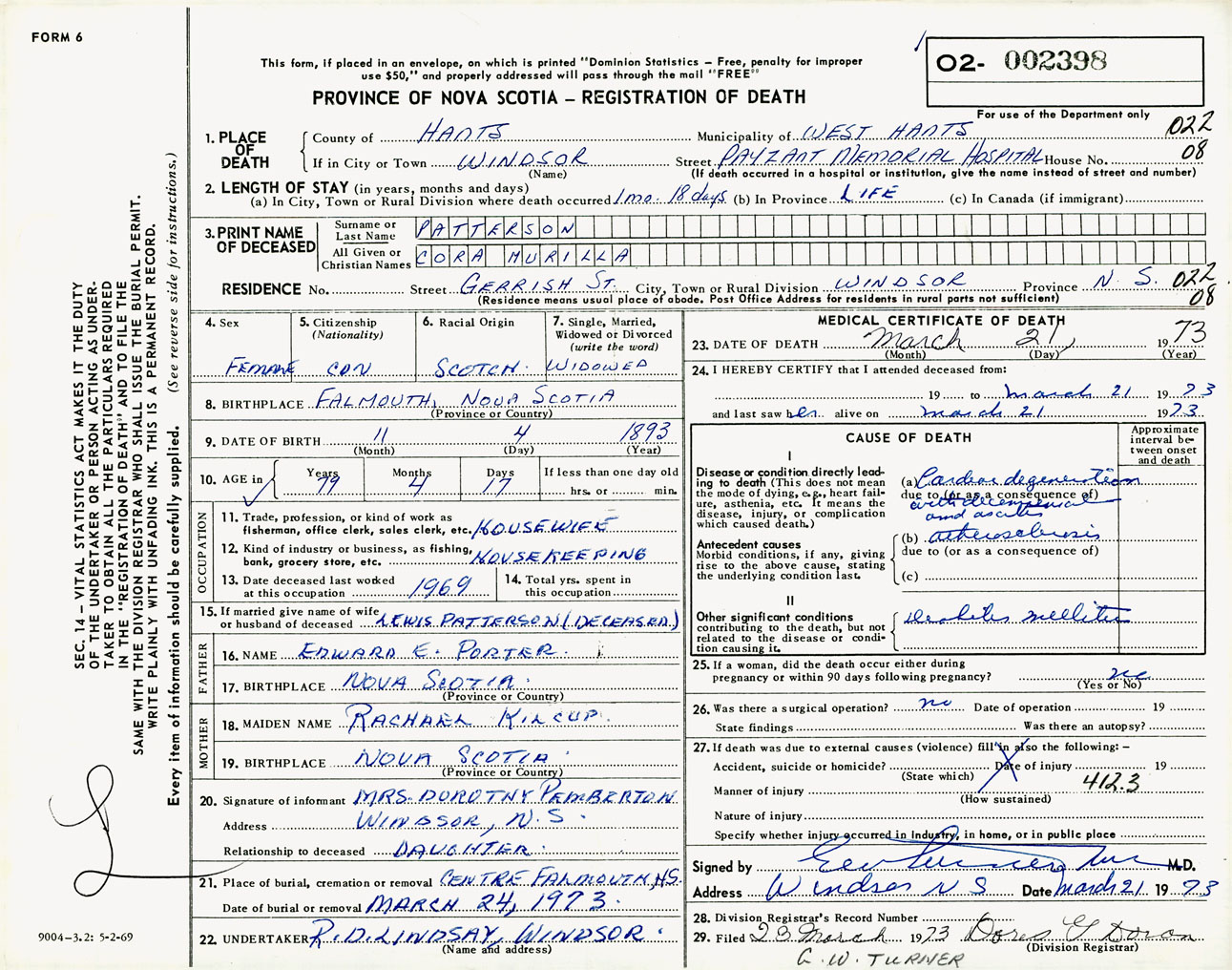 Female Death Registration: Year: 1973 number: 2398