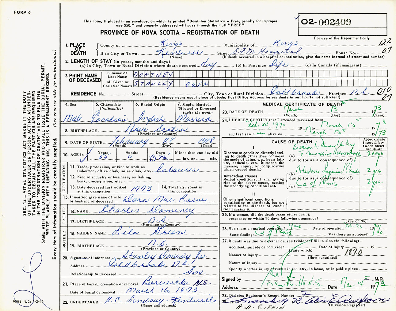 Male Death Registration: Year: 1973 number: 2409